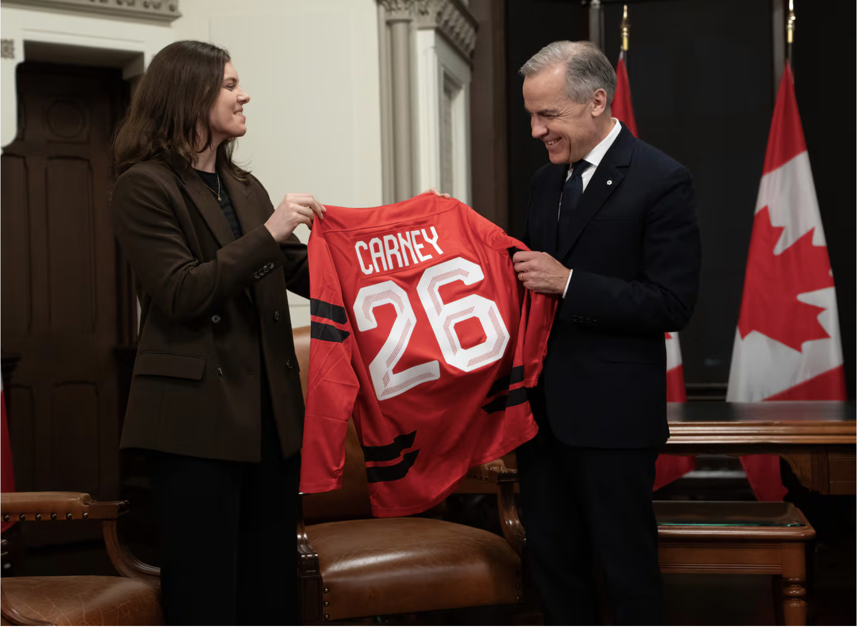 Women's National team hockey player Emily Clark presents Prime Minister Mark Carney with an Olympic hockey jersey during a photo op in his office on Parliament Hill in Ottawa, Tuesday, Jan 27, 2026. THE CANADIAN PRESS/Adrian Wyld