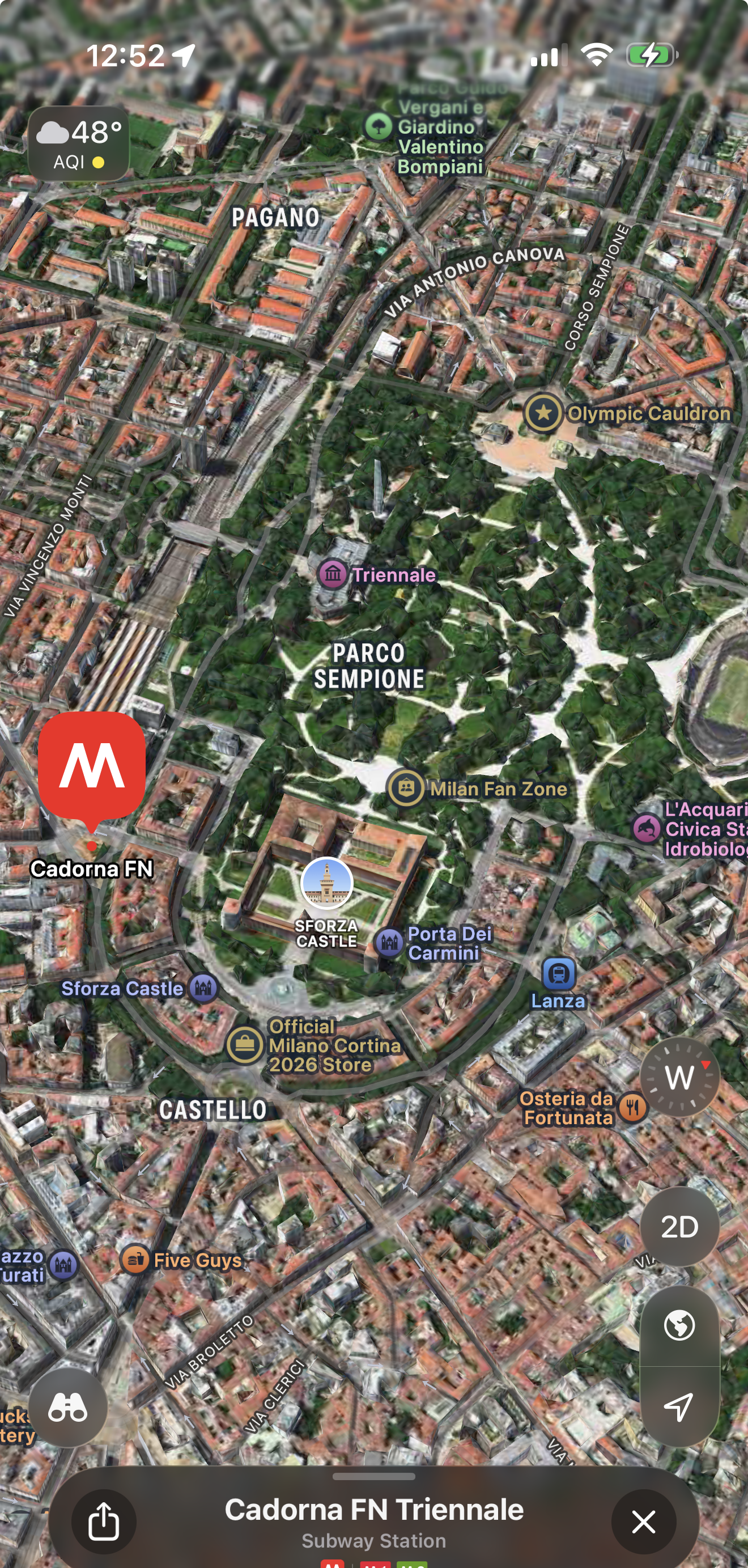 The subway stops that are relatively close but still a mile away is CARDONA as well as LANZA. I would suggest that you CHECK OUT THE CASTLE FIRST and then walk through the center of it past the COCA COLA FAN CENTER on the right, the FAN LIVE SITE on the left and then about 1/2 mile basically all sloping downhill to the ARCO della PACE. Beyond it is bars and restaurants with outside eating.
